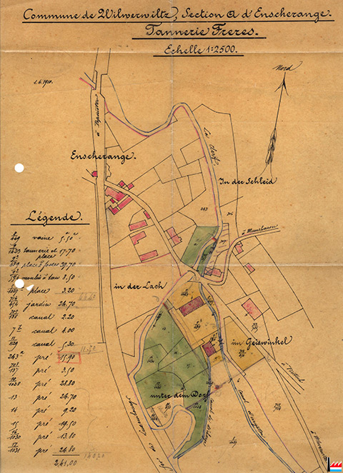 ![]() Tannerie Frères, Enscherange - 1.4.1910 (Collection: industrie.lu) canal de décharge - canal d'irrigation chemin de fer de Luxembourg à Pepinster |