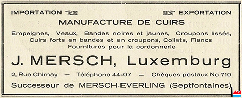 | <=1935 | ![]() Manufacture de cuirs J. Mersch, Luxembourg, successeur de Mersch-Everling, Simmern - 1935 (Collection: industrie.lu) Luxembourg, 2 rue Chimay, tél: 4407 |