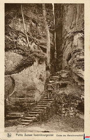 Petite Suisse luxembourgeoise - Entrée des Werschrumschlüff - Werschrummschlëff, route de Grundhof - Berdorf - <=1935 (Carte postale: E.A. Schaack, Luxembourg, No 52 - Nels; collection: industrie.lu)