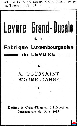 | 1936 | Marque de fabrique N° 7841 - 19 février 1936 Fabrique luxembourgeoise de Levure A. Toussaint à Wormeldange-sur-Moselle Produit : Levure de la maison déposante |