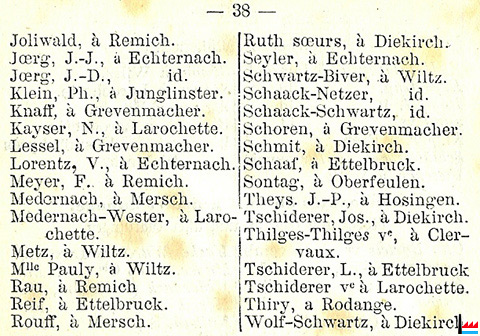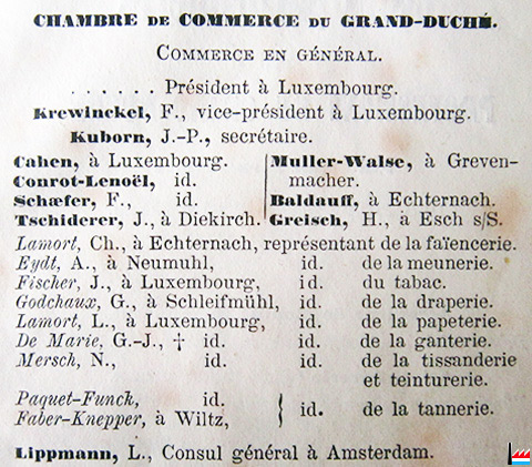 (Source: Almanach du Commerce du Grand-Duché de Luxembourg par N.C., 1re année, 1857, Luxembourg, Heintzé Frères, Libraires-Éditeurs; page 23; Collection: famille Aschman-Bodson)