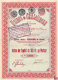 | 24.5.1913 | Usines de Châtelineau S.A.: Le capital social a été porté à 14.000 actions de 500 francs chacune et 4.000 parts de fondateur sans désignation de valeur | ||