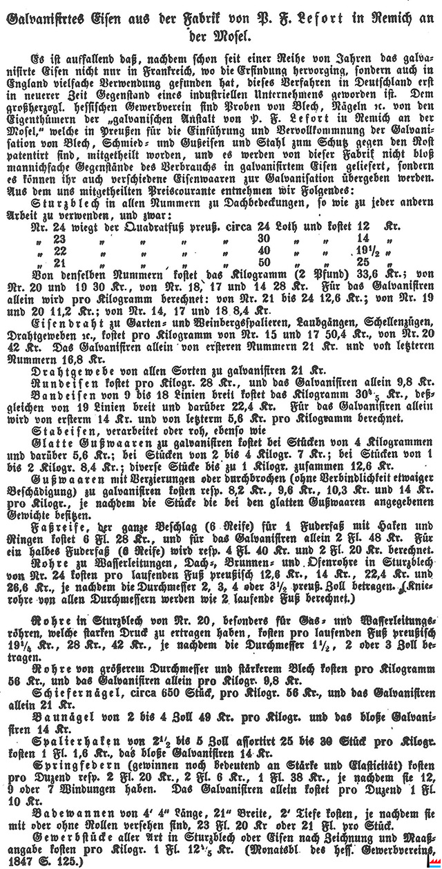 Es ist auffallend daß, nachdem schon seit einer Reihe von Jahren das galvanisirte Eisen nicht nur in Frankreich, wo die Erfindung hervorging, sondern auch in England vielfache Verwendung gefunden hat, dieses Verfahren in Deutschland erst in neuerer Zeit Gegenstand eines industriellen Unternehmens geworden ist. Dem großherzogl. hessischen Gewerbeverein sind Proben von Blech, Nägeln . von den Eigentümern der „galvanischen Anstalt von P. F. Lefort in Remich an der Mosel" , welche in Preußen für die Einführung und Vervollkommnung der Galvanisation von Blech, Schmied- und Gußeisen und Stahl zum Schutz gegen den Rost patentirt sind, mitgetheilt worden, und es werden von dieser Fabrik nicht bloß mannichsache Gegenstände des Verbrauchs in galvanisirtem Eisen geliefert, sondern es können ihr auch verschiedene Eisenwaaren zur Galvanisation übergeben werden. Aus dem uns mitgetheilten Preiscourante entnehmen wir Folgendes: