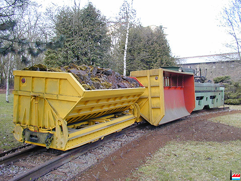 Monument: Locomotive électrique de mine MMR No 34? / ex No ? Mine de Nondkeil (Jeumont; 1958) avec wagons type "F" au parc du Casino des ingénieurs à Rodange, 40 rte de Longwy (Photos: 3.4.2003 jmo)