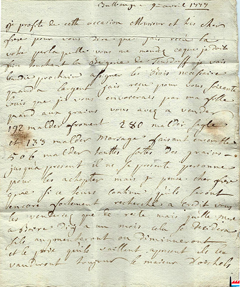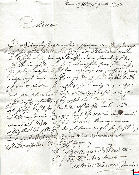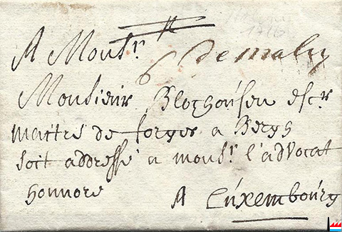 | 9.4.1777 | ![]() A Monsieur de Blochausen, ... de Mensberg (château de Malbrouck) la Rochette et autres (Collection: Jean Diederich) maître des forges de Bergh à Bergh |