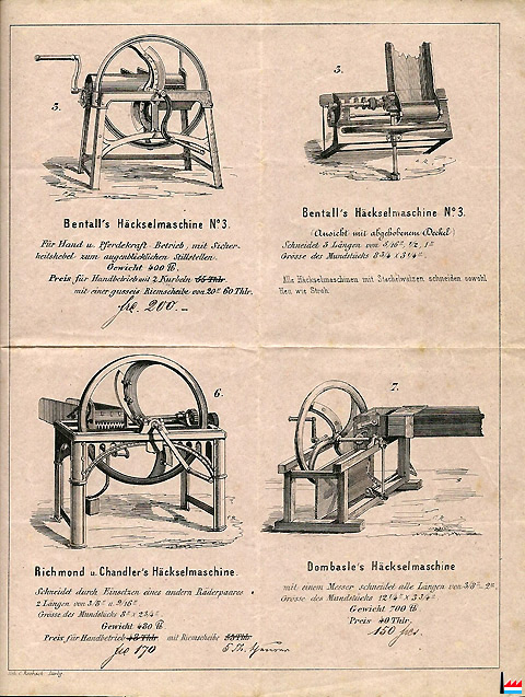 | Neueste und Vorzüglichste Futtermaschinen der Landwirtschaftlichen Maschinen und Geräthe - Fabrik von F. MAJERUS & SCHOELLER. Eisenhütte COLMAR-BERG Grossherzogthum Luxemburg. Gr. Gold Medaille. Paris 1855 Silb. Medaille. Trier 1854 Gold. Medaille. Luxemburg 1852 Gold. u. Silb. Medaillen. Dinant 1864 und Arlon 1851. 1866. Gold. Medaille. Metz 1861 Köln 1865 1. Bentall’s Häckselmaschine N° 1 2. Bentall’s Häckselmaschine N° 2 3. Bentall’s Häckselmaschine N° 3 4. Guillotin Häckselmaschine 5. Dean’s Häckselmaschine 6. Richmond und Chandler´s Häckselmaschine 7. Dombasle´s Häckselmaschine 8. Bentall´s Mussmaschine 9. Dombasle´s Rübenschneidmaschine 10. Turner´s Hafer und Bohnenquetschmühle 11. Transportable Mahlmühle Source: Catalogue illustré de 1866/1867 (?) (Collection Charles-Louis Aschman) |