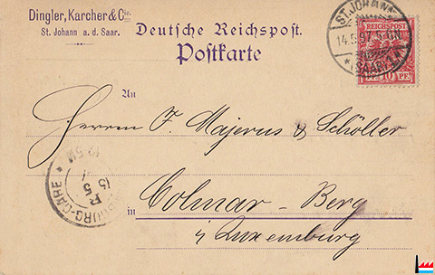 | 1897 | ![]() Dingler, Karcher & Cie, St. Johann a.d. Saar - F. Majerus & Scholler, Colmar-Berg - 13.5.1897 (Collection: industrie.lu) |