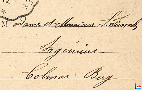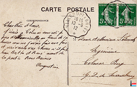 | 1912 | ![]() Carte postale envoyée de Mancieulles - 19.9.1912 (Carte postale: collection industrie.lu) Ingénieur L. Funck ?, Colmar-Berg (Lien avec l'Usine de Colmar-Berg? ) |