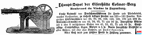 | <=1877 | A. SCHOELLER & Cie Colmar-Berg landwirtschaftliche Maschinenfabrik Constructionswerkstatt u. Eisengießerei |