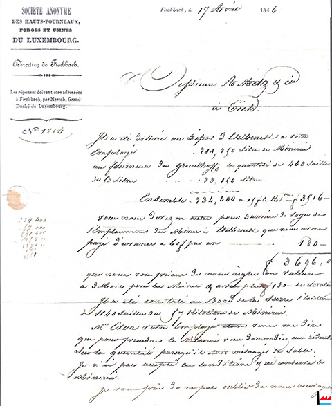 | 4.1847 | ![]() Motus Louis-Albert, directeur de la Société Anonyme des Hauts-Fourneaux, Forges et Usines du Luxembourg - Direction de Fischbach - Extrait d'une lettre du 17.4.1846 à A. Metz à Eich (Collection: Robert Goldschmit) Il me reste encore 29 kilolitre de Minerai de Mamer à fournir à Bissen, je ne pourrai donc vous prêter le lavoir que quand je n'en aurai plus besoin. ... ... |