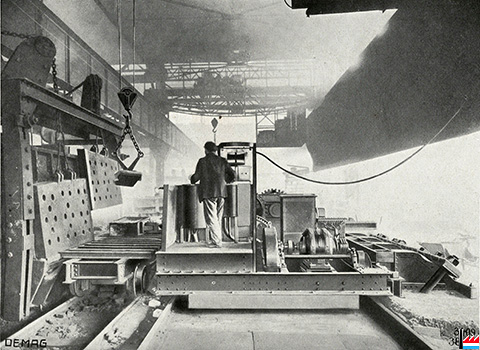 Enfourneuse DEMAG, livrée à l'Usine d'Homécourt (Catalogue: Le laminoir - DEMAG, Duisburg, 1918; collection: Philippe Aschman)