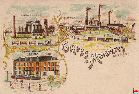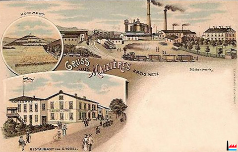 Hüttenwerk (3 Schornsteine), Maizières, Kreis Metz - Restaurant J. Gallo (Date sur la carte postale: 1898) (Carte postale: Deutsche Buchhandlung,Metz; Kunst Anstalt Rosenblatt Frankfurt am Main; Collection: Luciano Pagliarini)