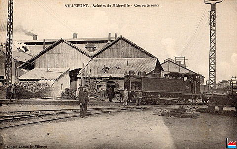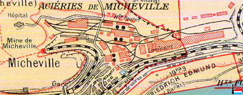 | 1910 | ![]() Usine de Villerupt - Micheville (Übersichtskarte des Erzgebietes bei Deutsch-Oth, Esch und Villerupt - Kaiserliche Eisenbahn-Generaldirektion, Strassburg - 2.1910) Schiefe Ebene mit elektrischem Wagenaufzug Stahlwalzwerke Hochöfen Schlackengleis Schlackenhalde |