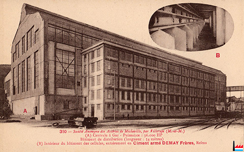 Aciéries de Micheville - A : Centrale à Gaz - Puissance: 36.000 hp - bâtiment de distribution (longueur: 54 m) - B: Intérieur du bâtiment des cellules, entièrement en ciment armé Demay Frères, Reims (Carte