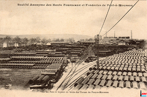 Société Anonyme des Hauts-Fourneaux de Pont-à-Mousson - Vue du Parc à tuyaux en fonte des Usines de Pont-à-Mousson (Carte postale; collection: jmo)