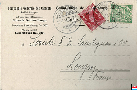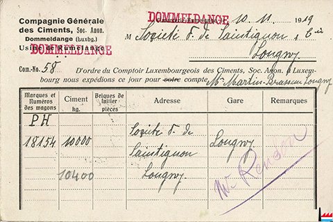 | 1919 | ![]() Compagnie Générale des Ciments S.A., Dommeldange - D'ordre du Comptoir Luxembourgeois des Ciments S.A., Luxembourg nous expédions ce jour 10.000 kg ciment à la Société F. de Saintignon & Cie, Longwy pour le compte de Martin Brasseur, Longwy - 10.11.1919 (Collection: industrie.lu) |