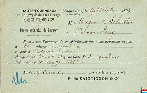 | 10.1898 | ![]() Livraison de 20 t de fonte N°3 peau lisse à Majerus et Schoeller, Colmar-Berg par les Hauts-fourneaux de Longwy & de La Sauvage F. de Saintignon & Cie - 29.10.1898 (Collection: industrie.lu) |