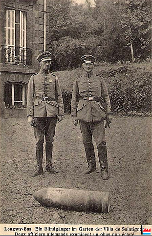Villa de Saintignon, Longwy-Bas - Blindgänger - 2 officiers allemands examinent un obus non éclaté