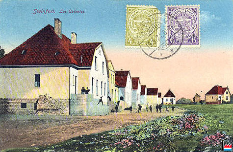 Steinfort - Maisons de l'usine de 1907 avec le crassier à l'avant plan, vers 1920 (Extrait de la carte postale: Manufacture de cartes P. Houstraas, Luxembourg, Rue des Augustins; collection: industrie.lu)