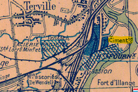 Usines de Thionville - Cimenterie (Détail de la Carte dressée et dessinée par G. Peltier - 21 rue de l'Union - Clamart - Paris; 1920)