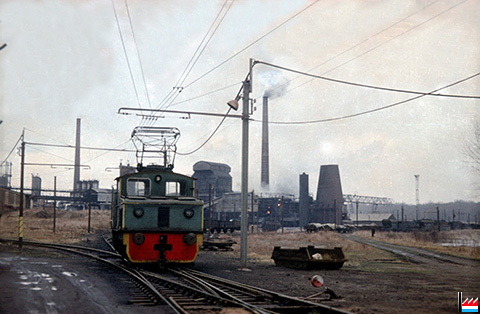 Thionville - Diedenhofen: Elektrolok und Kokerei und Kohlenturm im Hintergrund (Photo: vers 1973 Ulrich Deuchler)