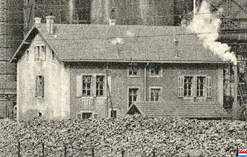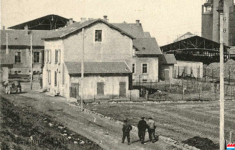 - La gare, le chemin de fer aérien et à la droite les Hauts-Fourneaux