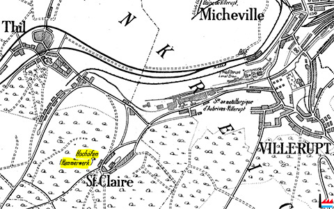 | 1910 | ![]() Hochöfen (Hammerwerk) Sainte-Claire (Übersichtskarte des Erzgebietes bei Deutsch-Oth, Esch und Villerupt - Kaiserliche Eisenbahn-Generaldirektion, Strassburg - 2.1910) |