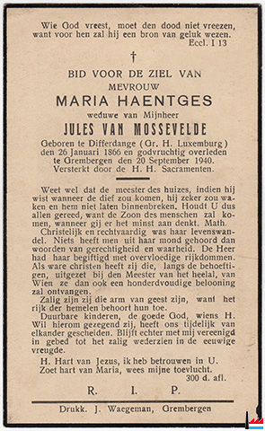 Décès de Maria Haentges, veuve de Jules van Mossevelde