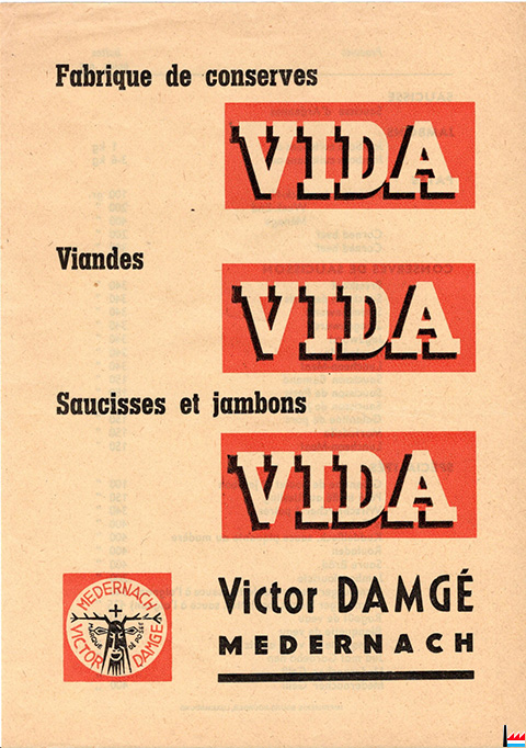 | 10.5.1949 | VIDA Fondation par - Gründung durch die Metzgermeister François Weber, Neudorf und Victor Damgé, Mersch Raum zur Herstellung von Zossis mit Klimaanlage, erbaut durch Emile Hentzen aus Luxemburg Lift in der Fabrik, erbaut durch die Gebrüder Offermann aus Mersch |