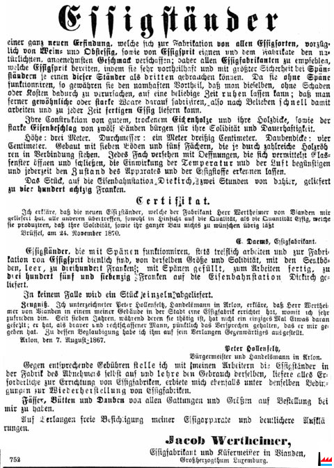| 1867/1871 | Essigständer: Erfindung von Jacob Wertheimer Ihre Construktion von gutem, trockenem Eichenholze und ihre Holzdicke, sowie der starke Eisenbeschlag von zwölf Bänden bürgen für ihre Solidität und Dauerhaftigkeit. Das Stück, auf die Eisenbahnstation Diekirch, zwei Stunden von dahier, geliefert zu 480 Franken. |