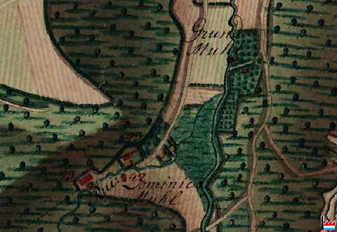 DominicsMühl (Dominiksmühle, Befort) et GrundMühl (Grundmühle, Berdorfer Mühle, Vogelsmühle), Grundhof - 1777 (Carte de Ferraris - Bibliothèque royale de Belgique - 2010)