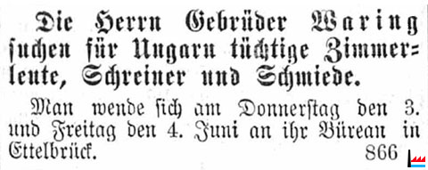 ![]() Die Gebrüder Waring suchen für Ungarn tüchtige Zimmerleute, Schreiner und Schmiede - Büreau Ettelbrück (LW: 30.05.1869) |