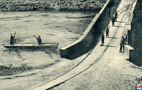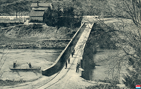Die Bleche des Whitwell Winderhitzers finden beim Bau der privaten Sauerbrücke Verwendung Ab 1902 führt ein normalspuriges Anschlussgleis über die Sauerbrücke, vorher war es ein Feldbahngleis |