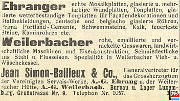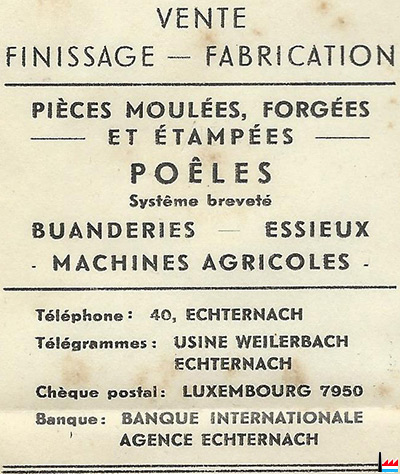 | 1939 | Die Société Luxembourgeoise des Usines de Weilerbach verzeichnete für das Geschäftsjahr 1939 einen Nettoüberschuss von 1109,10 Franken. | ||