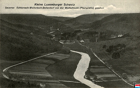 Weilerbacher Hütte im Sauertal - Echternach - Weilerbach - Bollendorf von der Wolfsschlucht (Paulsplatte) gesehen (Postkarte: J.M. Bellwald, Echternach No 194b; Collection: industrie.lu)