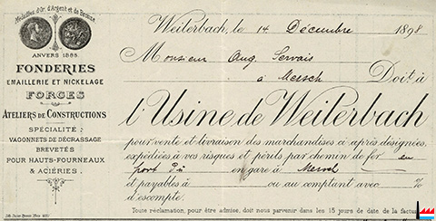 ![]() l'Usine de Weilerbach - facture du 14.12.1898 à Auguste Servais, Mersch (Collection: Familienarchiv Servais) |