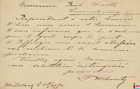 | 10.1890 | ![]() L'Usine de Weilerbach, Wilwertz, administrateur délégué, à Paul Wurth, pour adresse Eugène Muller - Constructeur, Luxembourg - de - 19.10.1890 (Collection: industrie.lu) Répondant à votre honorée d'hier nous avons l'honneur de vous informer que les 4 colonnes pour le garde-corps des ponts de Peffingen (?) vous seront adressées vers milieu de la semaine prochaine. |