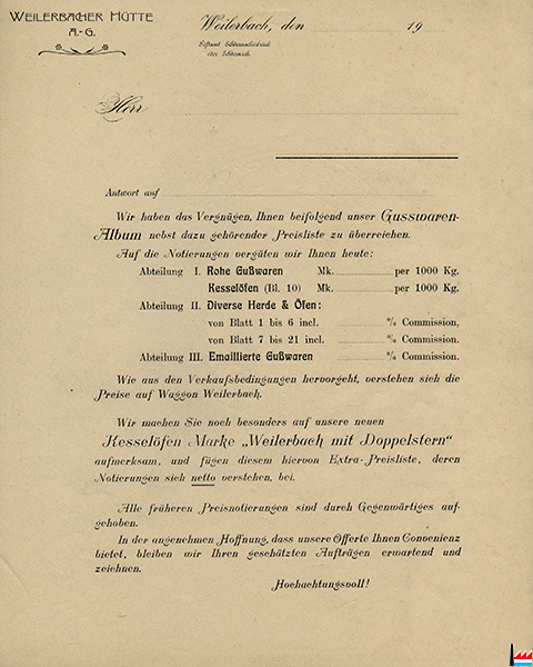 Stück-Preisliste über Öfen und Herde Weilerbacher Hütte Postamt Echternachbrück oder Echternach Eisengiesserei |