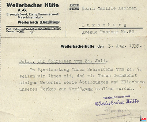 23.9.1935 - Usines de Weilerbach - Weilerbach par Echternach - Enveloppe à entête - Archives Camille Aschman Jr. - Collection famille Aschman-Bodson.