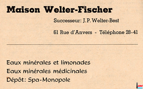 Jean Welter - Fischer Fabrique d'Eaux Minérales et de Limonade Gazeuse 61 rue d'Anvers (rue Feldgen) Luxembourg - Gare Téléphone: 2841 |