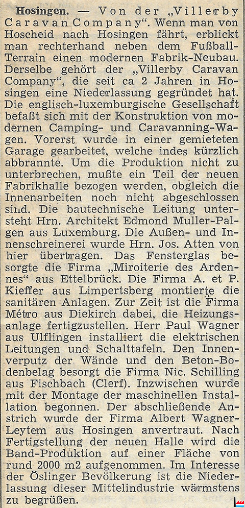 | 6.2.1964 | Fondation - Gründung : Willerby Caravan Company Luxembourg / Hosingen Capital: 2.300.000 LUF Siège social: Hosingen |