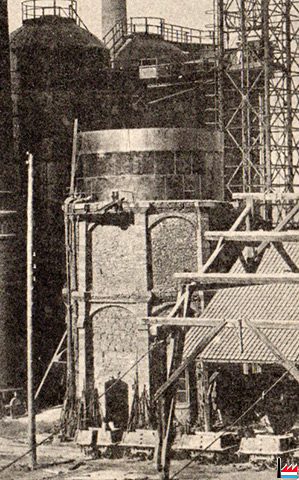(Photo N° 3875) Haut-fourneau N°1 construit en 1865, transformé en 1876 et démoli en 1901, simultanément avec le haut fourneau N° 2. La photo a été prise au cours de la démolition. Un seul fourneau N° II produisant 100 t de fonte par jour a remplacé les 2 fours démolis. On peut voir la tubelure intérieure des appareils à air chaud qui précévaient les appareils Cowper.
