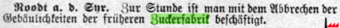 | 1898 | Roodt an der Syr - Zur Stunde ist man mit dem Abbrechen der Gebäulichkeiten der früheren Zuckerfabrik beschäftigt. (OMZ: 8.3.1898) |